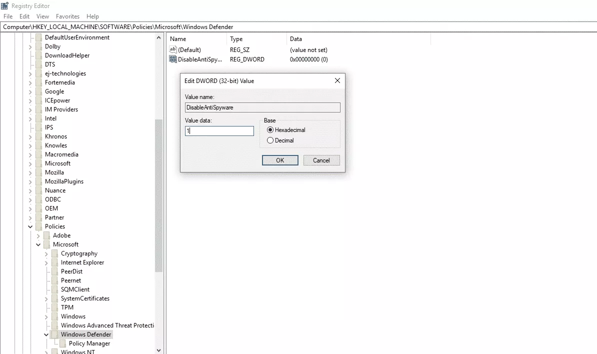 Step 5: Right-click the DisableAntiSpyware item and set the Value Data to 1.